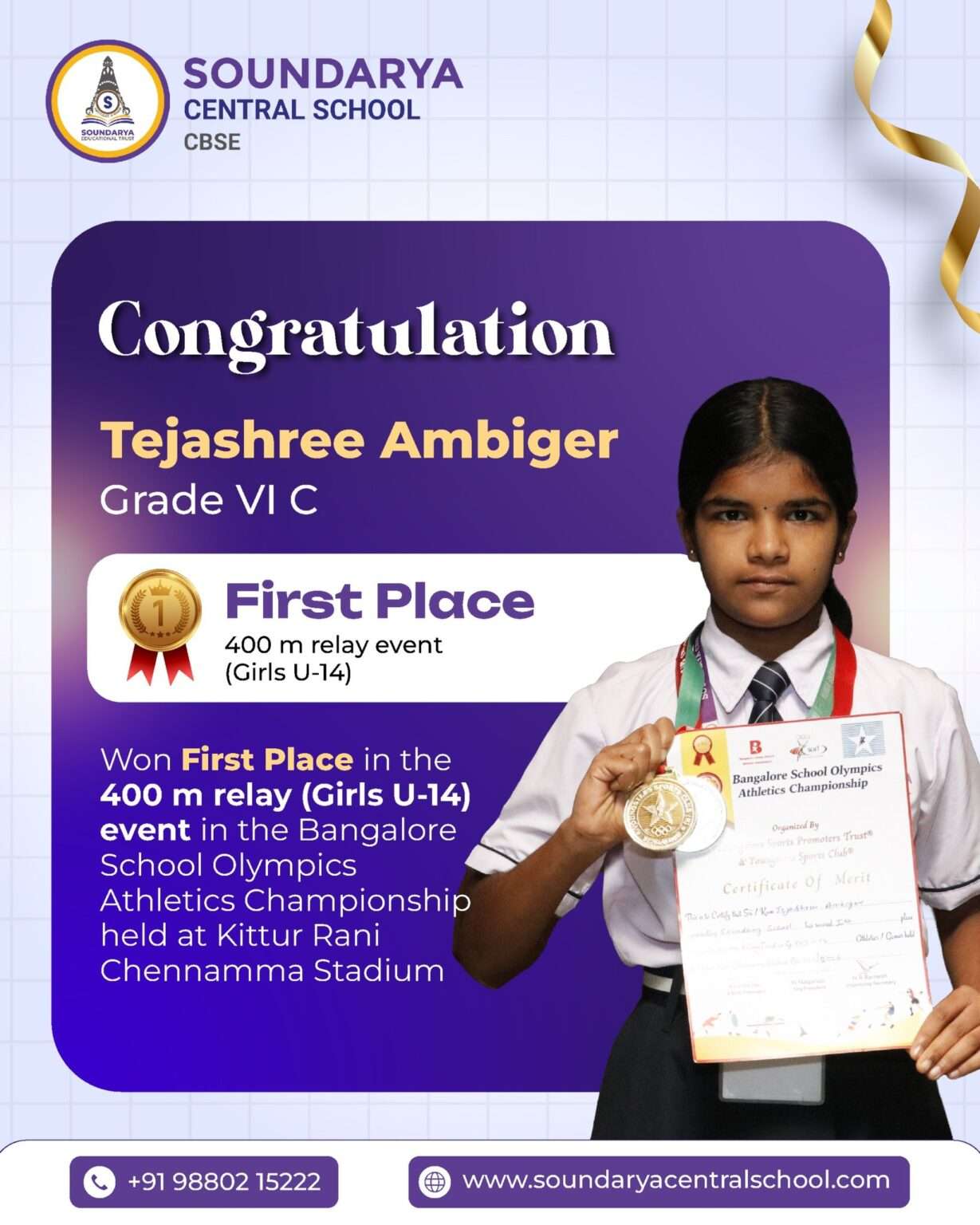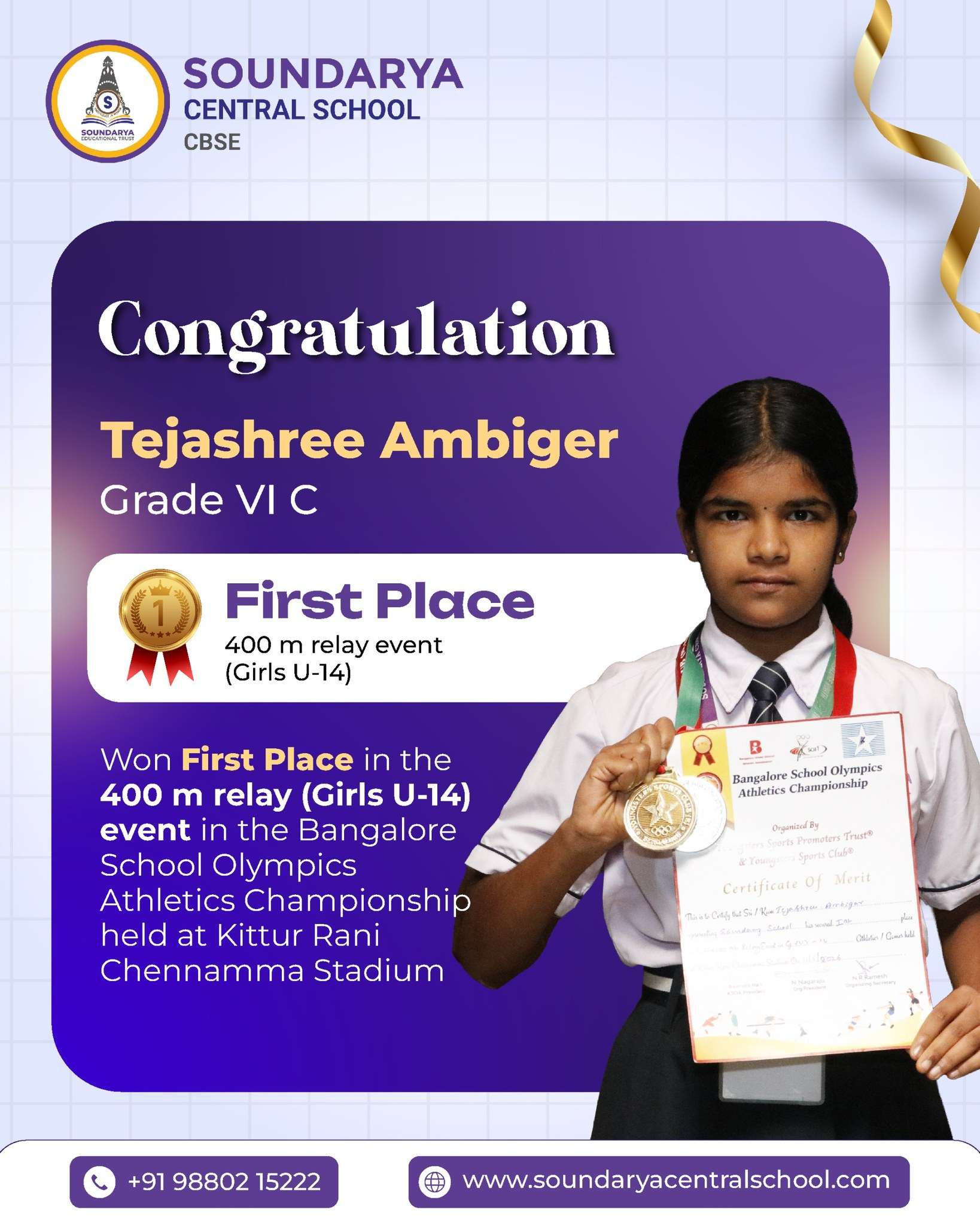 Tejashree Ambiger of Grade VI C made us proud by securing 1st Place in the Girls U-14 400m Relay at the Bangalore School Olympics Athletics Championship held at Kittur Rani Chennamma Stadium.