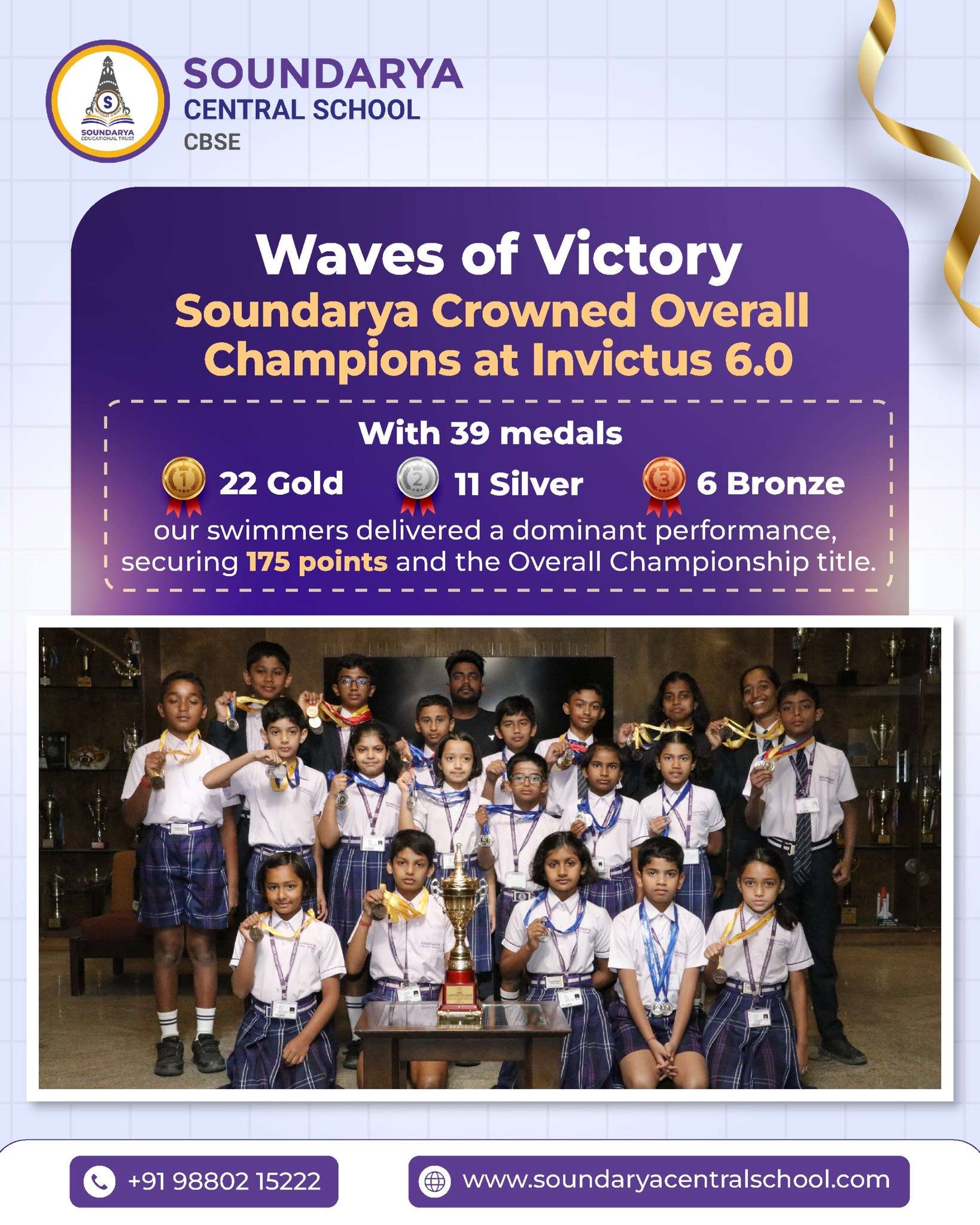 Soundarya Central School made waves at Invictus 6.0 Swimming Championship hosted by Euro School, Whitefield, Bengaluru (Nov 10–11, 2025).