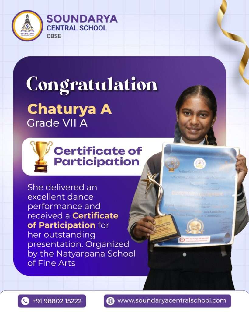 We are delighted to share that Chaturya A of Grade VII A, Soundarya Central School, participated in the Rashtriya Akhila Bharatha Nrityotsava, organized by Om Shree Sai Centre for Performing Arts at Kannada Bhavana, Chikkaballapura, Karnataka, on 21st December 2025.