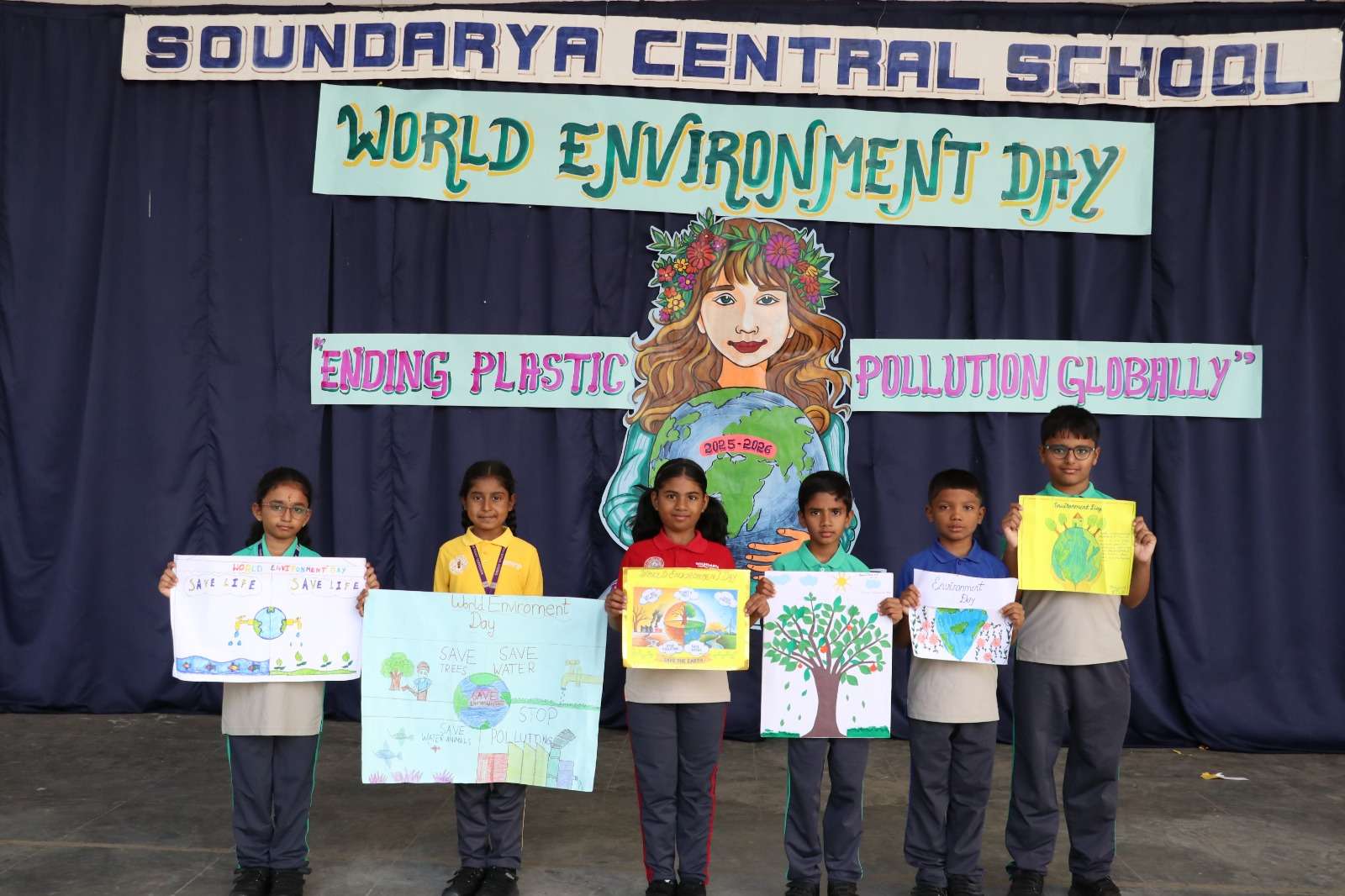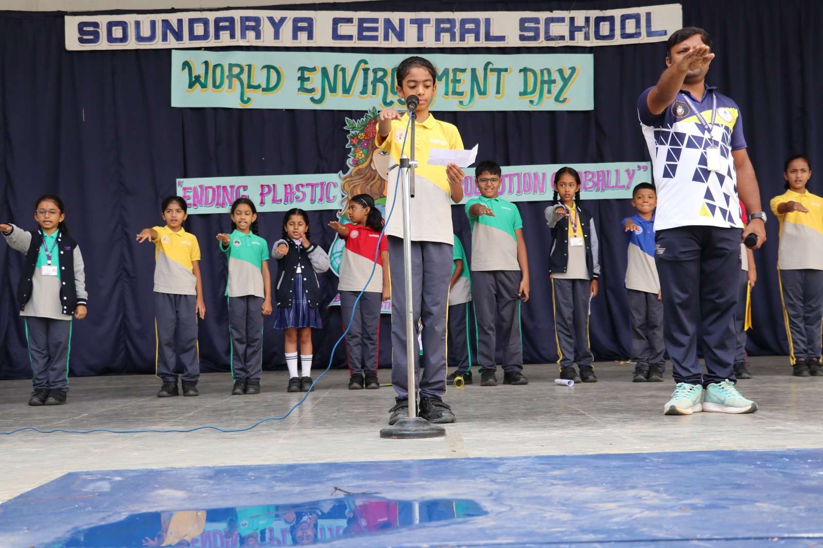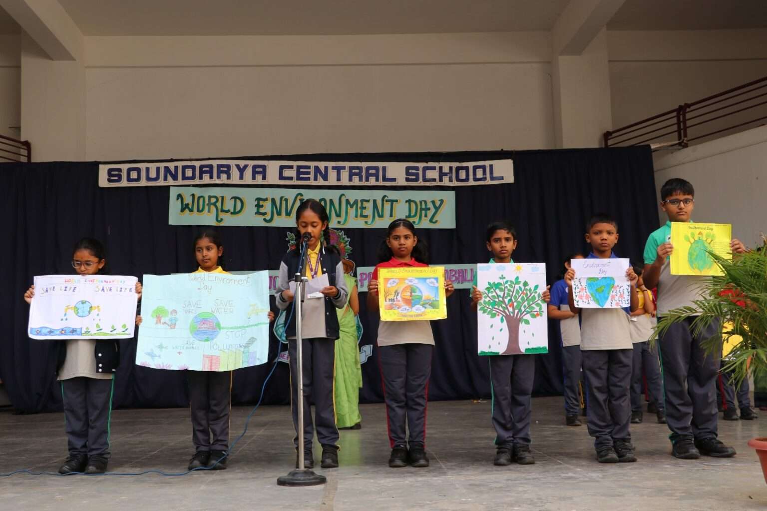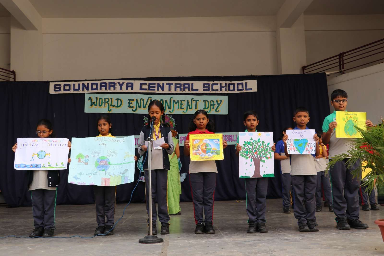 Soundarya Central School celebrated World Environment Day on 5th June 2025 in the morning assembly. The event aimed to raise awareness among students about environmental protection and sustainable living.The assembly began with the students presenting various information on emphasizing the need for planting trees, reducing waste, and conserving natural resources. Students presented information, conducted quiz, amazing fact about the nature and role plays of Sunderlal Bahuguna and Saalumarada Thimmakka talking about the importance of individual efforts in saving the planet. As a symbolic gesture, a plant was given to our Vice Principal.