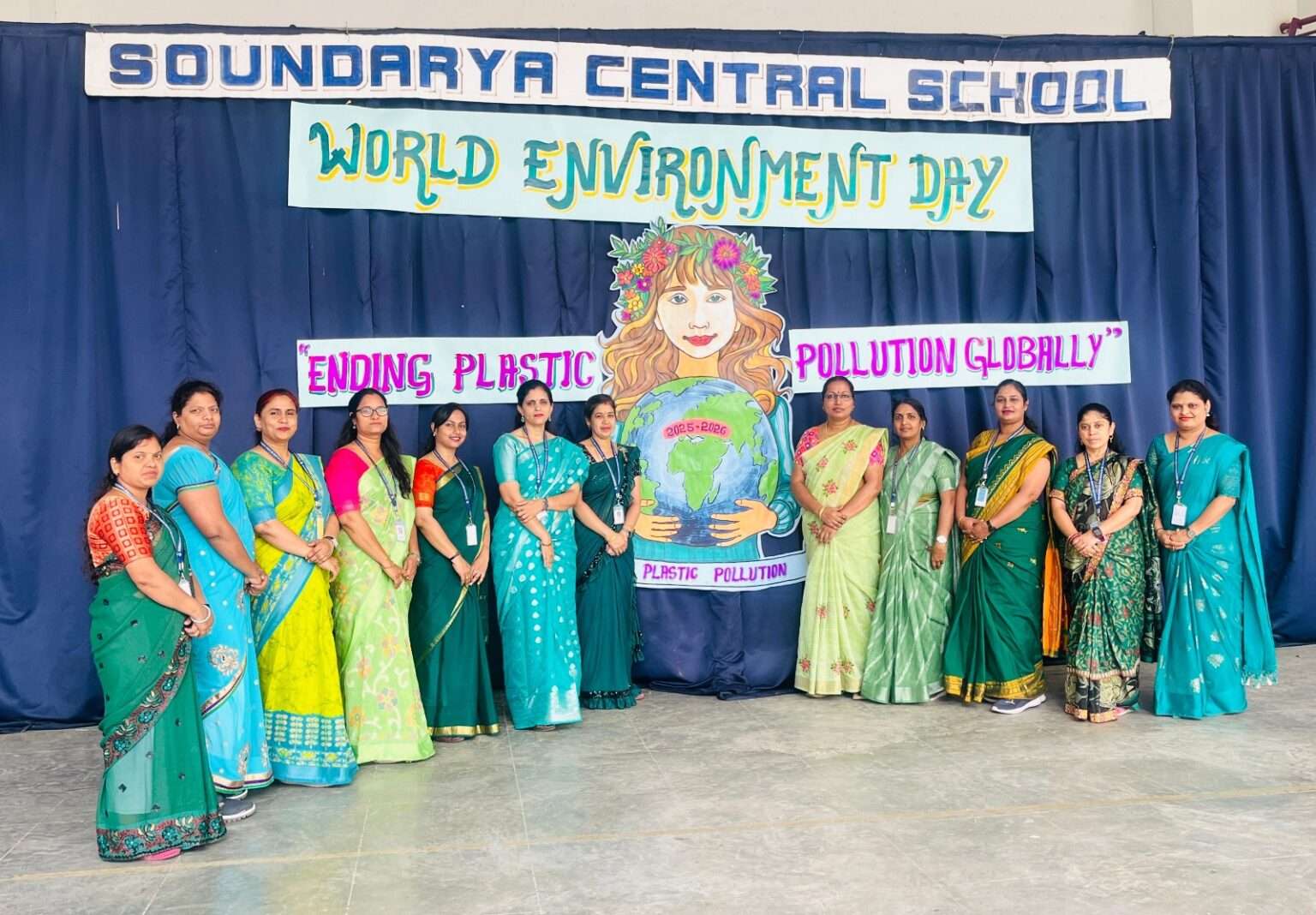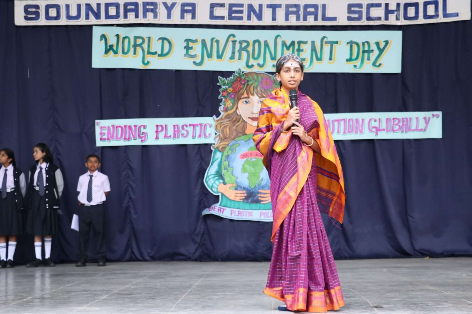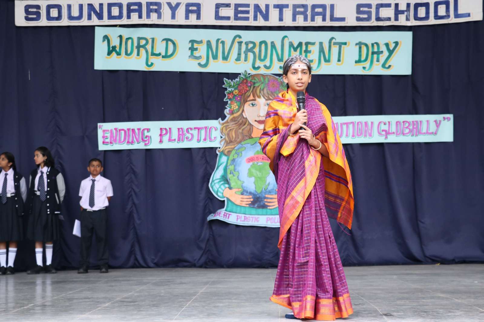 Soundarya Central School celebrated World Environment Day on 5th June 2025 in the morning assembly. The event aimed to raise awareness among students about environmental protection and sustainable living.The assembly began with the students presenting various information on emphasizing the need for planting trees, reducing waste, and conserving natural resources. Students presented information, conducted quiz, amazing fact about the nature and role plays of Sunderlal Bahuguna and Saalumarada Thimmakka talking about the importance of individual efforts in saving the planet. As a symbolic gesture, a plant was given to our Vice Principal.