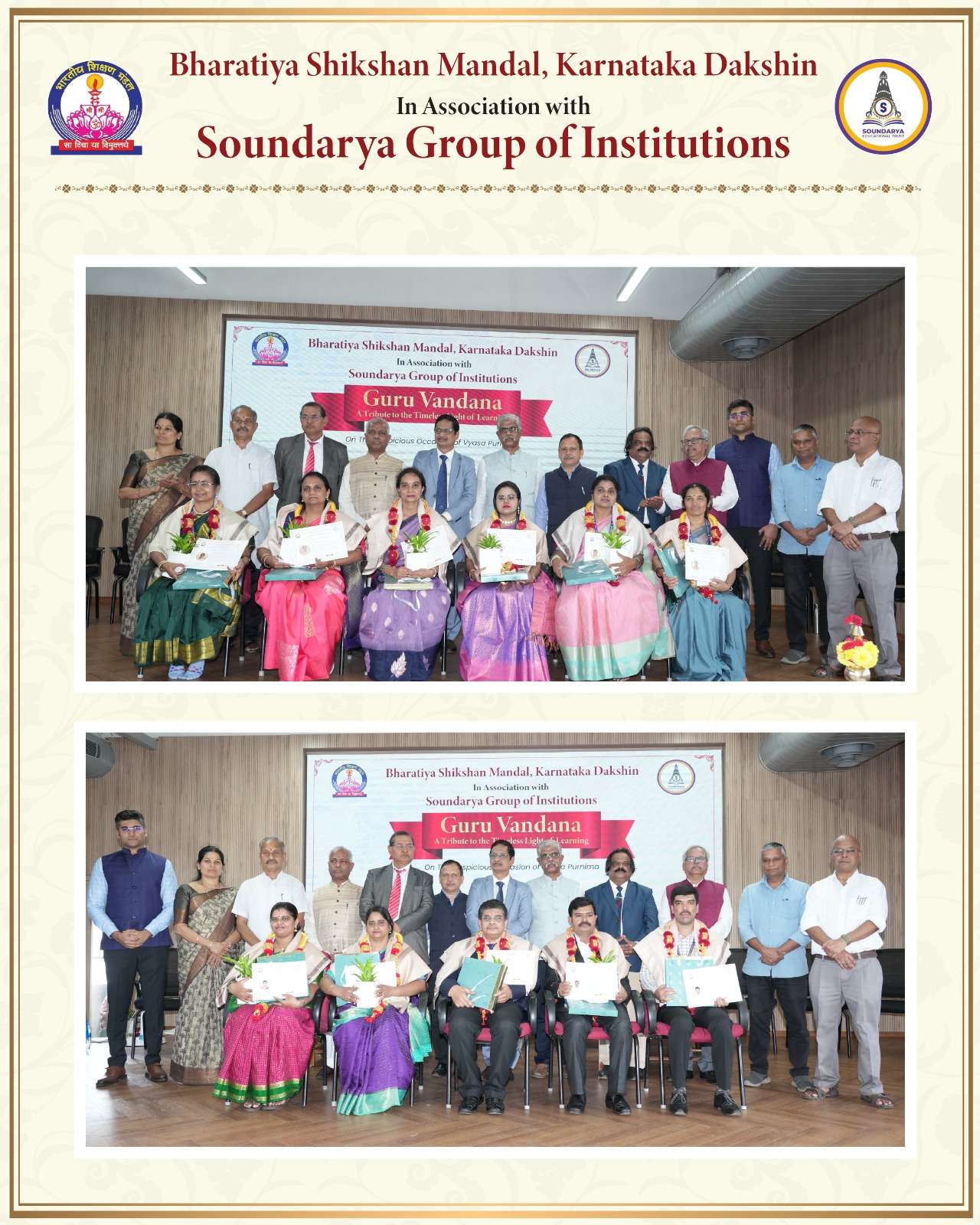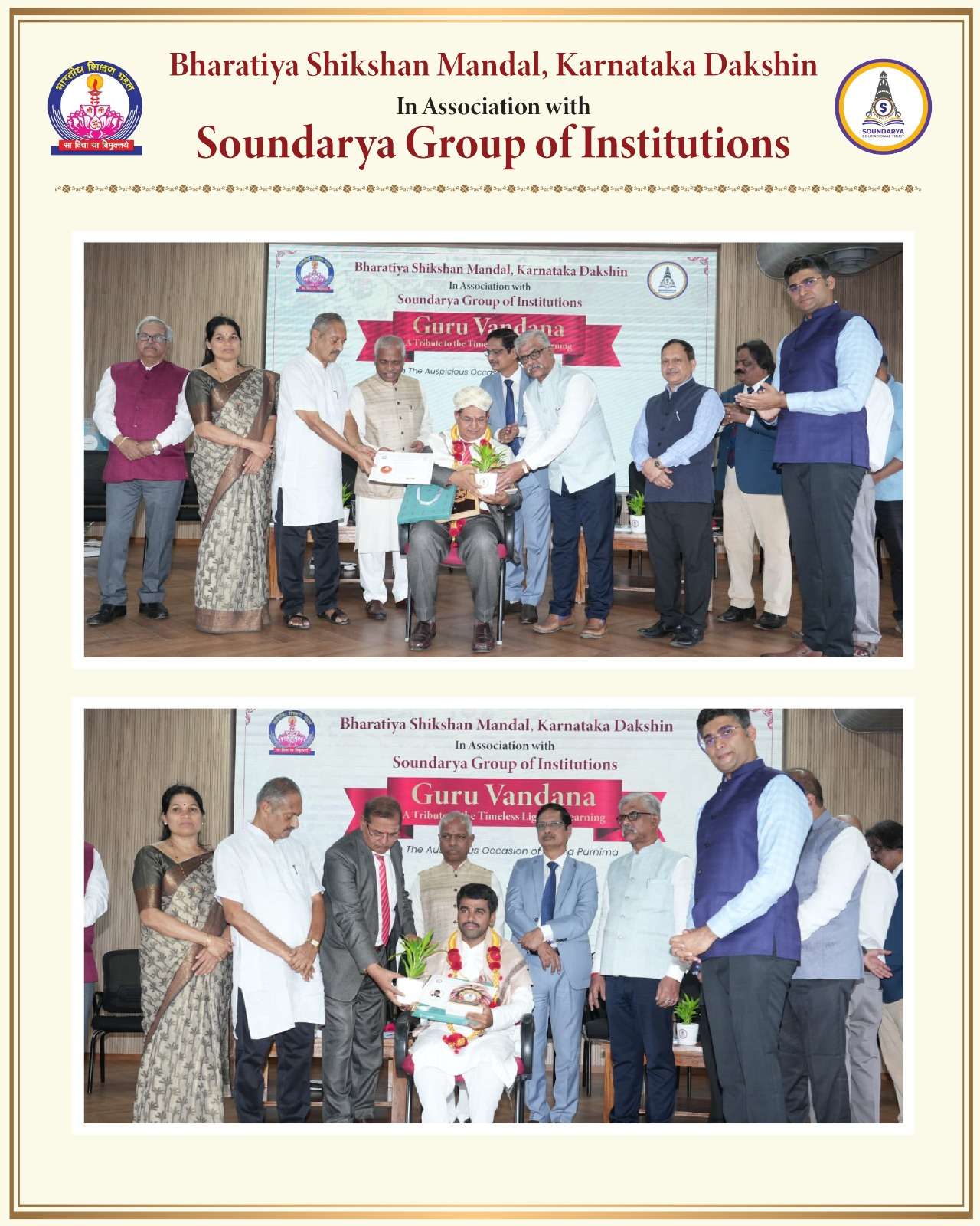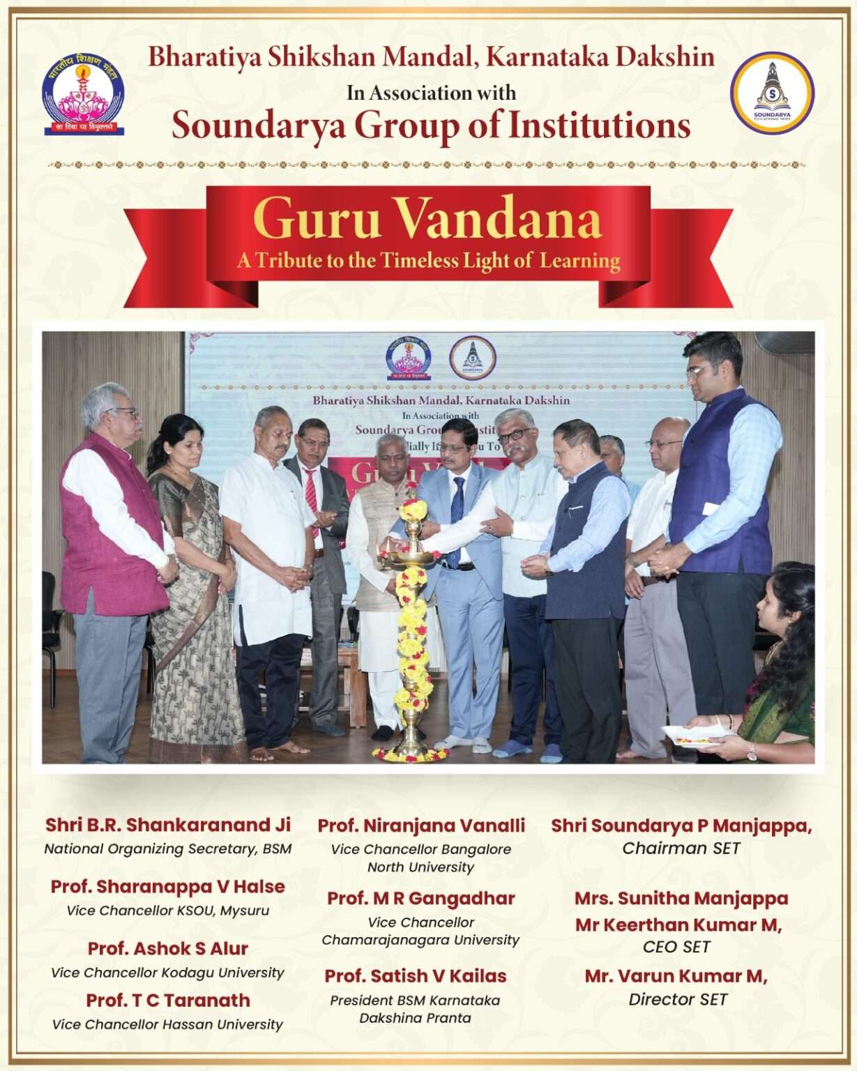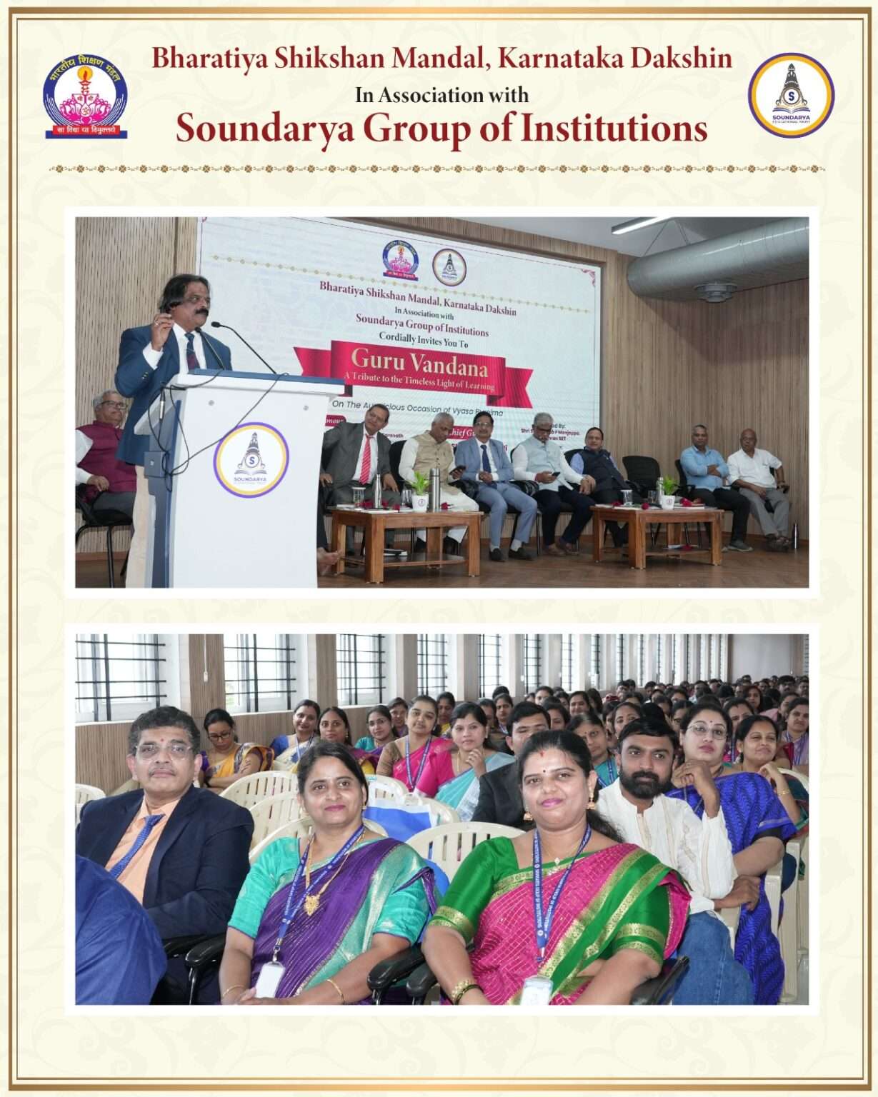 The Bharatiya Shikshan Mandal, Karnataka Dakshin, and Soundarya Group of Institutions held a “Guru Vandana” ceremony on Vyasa Purnima.he ceremony was graced by the esteemed Chief Guest, Shri B.R. Shankaranand Ji, the National Organizing Secretary of BSM.