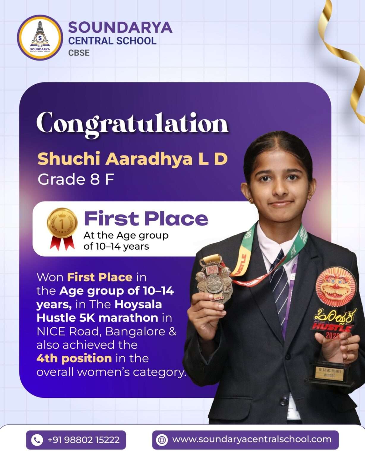 The Hoysala Hustle 5K marathon was conducted on 2nd November 2025 on NICE Road, Bangalore. Shuchi Aaradhya L D of grade 8 F participated in the event and secured 1st place in the age group of 10–14 years, with a timing of 20 minutes and 8 seconds. She also achieved the 4th position in the overall women’s category.