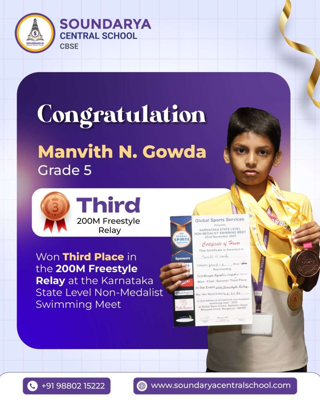 - Manvith N. Gowda (Grade V) for securing 3rd Position in the 200M Freestyle Relay with a stellar time of 2:33.86!