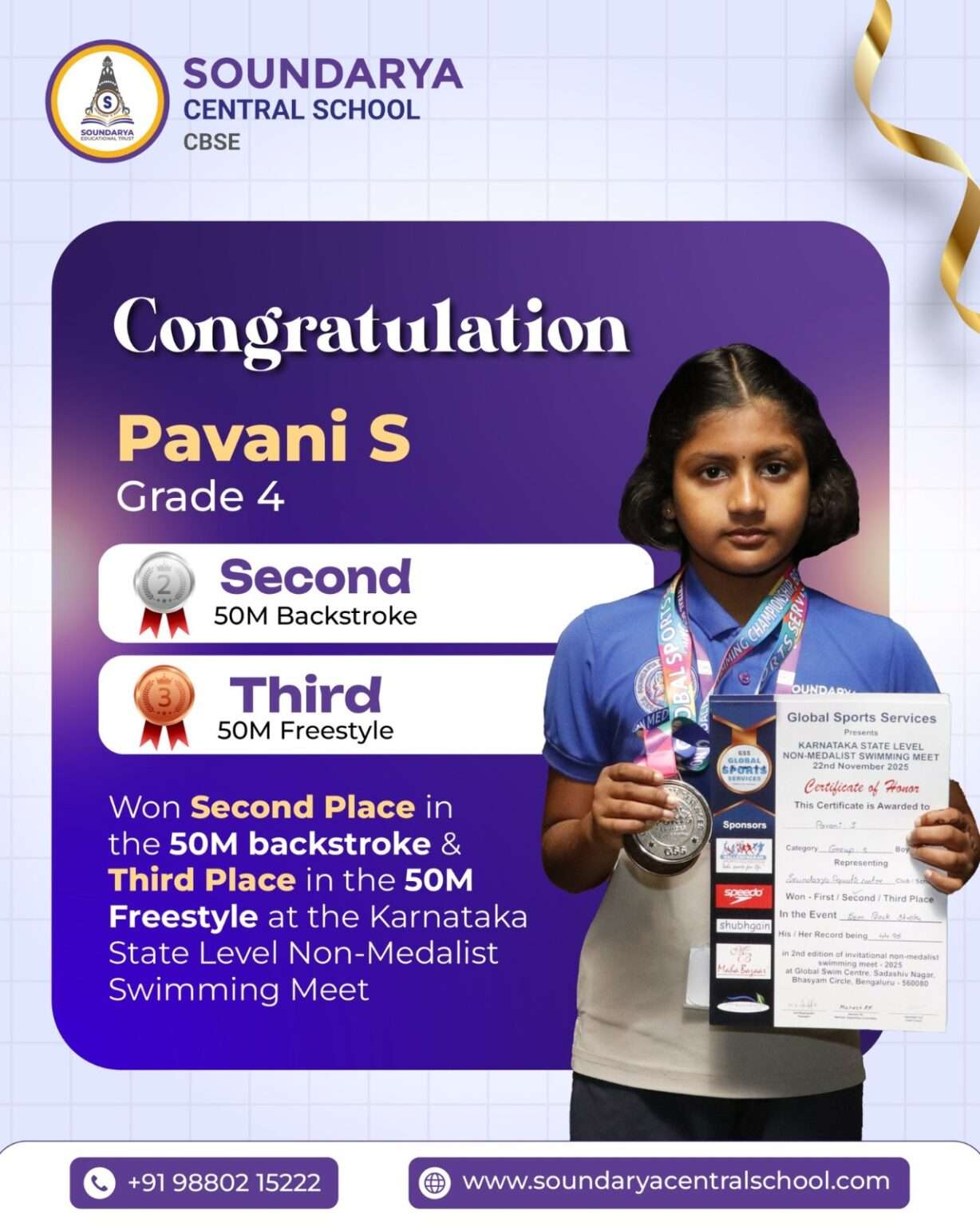 -  Pavani S (Grade IV) for her double victory—3rd in 50M Freestyle (37.52) and 2nd in 50M Backstroke (44.95)!