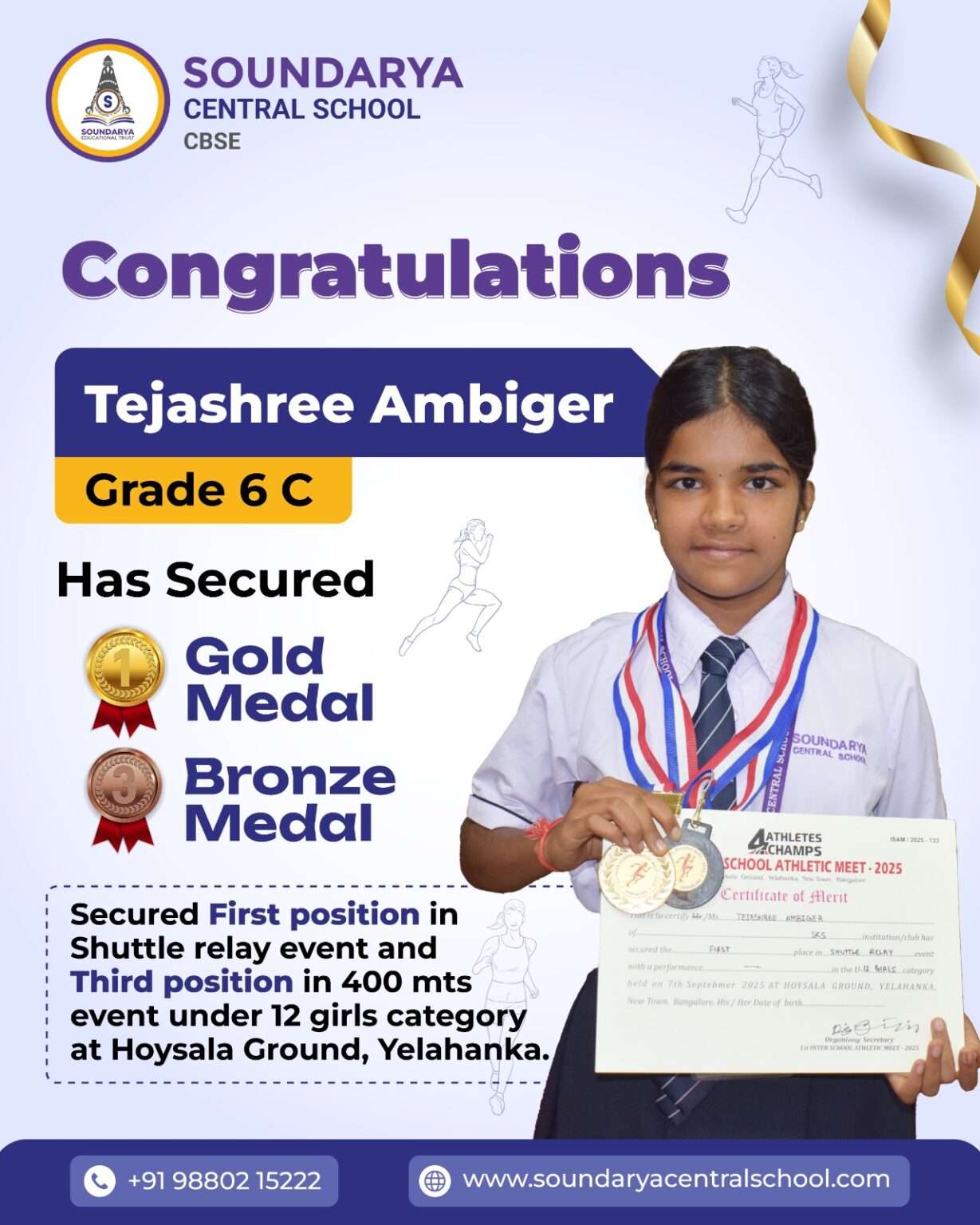 From Soundarya Central School,  Tejashree Ambiger of Grade 6C secured the First Place in the Shuttle Relay event and third position in 400mts event in  U-12 Girls category, delivering an excellent performance.