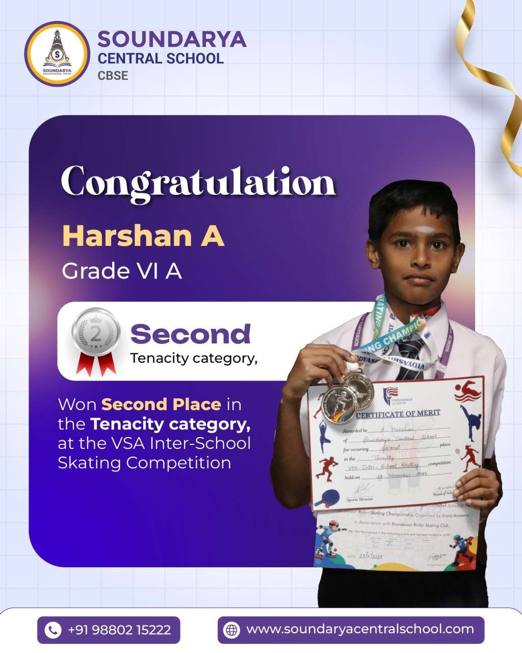 • Harshan A, Grade VI A, secured Second Place in the Tenacity Category at the competition held on 22nd November 2025, demonstrating excellent consistency and strong skating skills.